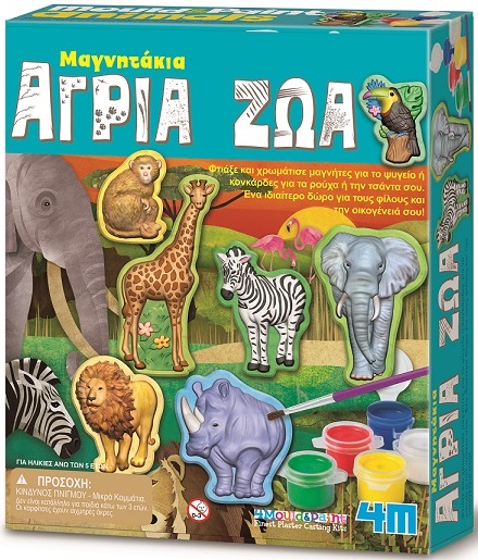 Φτιάξε και χρωμάτισε μαγνήτες για το ψυγείο ή κονκάρδες για τα ρούχα ή την τσάντα σου. Ένα ιδιαίτερο δώρο για τους φίλους και την οικογένειά σου! ΚΑΤΑΣΚΕΥΗ: Προετοίμασε τον γύψο ακολουθώντας τις οδηγίες και ρίξε το μείγμα στο καλούπι. Περίμενε λίγο μέχρι να σταθεροποιηθεί και έπειτα αφαίρεσέ τον και ζωγράφισε τα ζωάκια με τα παρεχόμενα χρώματα. Άφησε τα να στεγνώσουν εντελώς και έπειτα κόλλησε στην πίσω επίπεδη πλευρά τους μαγνήτες ή τις ειδικές καρφίτσες και δημιούργησε έτσι τους τέλειους μαγνήτες για το ψυγείο σου ή κονκάρδες για τα ρούχα και την τσάντα σου. ΠΕΡΙΕΧΟΜΕΝΑ: 1 καλούπι με 7 διαφορετικά σχέδια, 1 σακουλάκι με γύψο σε σκόνη, 1 ταινία με μαγνήτες, 2 καρφίτσες, 1 παλέτα με 5 διαφορετικά χρώματα, 1 πινέλο και αναλυτικές οδηγίες. Τα περιεχόμενα επαρκούν για την κατασκευή 7 ζώων. Περιέχονται οδηγίες στα Ελληνικά.
