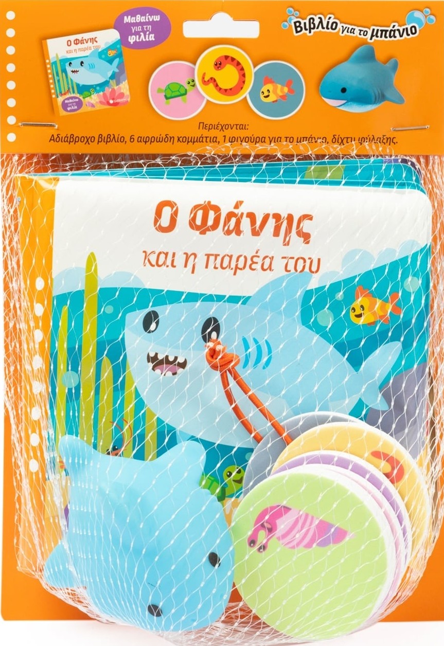 Το βιβλίο αυτό μαθαίνει στα μικρά παιδιά για τη φιλία. Είναι σημαντικό να μάθουν από μικρή ηλικία να συμπεριφέρονται με ευγένεια. Διαβάστε, μάθετε και παίξτε με το Βιβλίο για το μπάνιο, που κάνει τη ρουτίνα του μπάνιο ευχάριστη, χαλαρωτική και διασκεδαστική για σας και το παιδί σας: Χρησιμοποιείτε το διχτάκι και το λαστιχάκι για να φυλάτε το σετ σας όταν στεγνώνει. Τα αφρώδη κομμάτια κολλούν στην μπανιέρα όταν βραχούν. Αυτό γίνεται χωρίς χημικές ουσίες- μόνο χάρη στο κενό αέρος. Πάρτε το βιβλίο στο μπάνιο και αρχίστε να παίζετε και να μαθαίνετε. Η φιγούρα μπάνιου προάγει το παίξιμο ρόλων και ενισχύει τη λεπτή κινητικότητα του παιδιού.