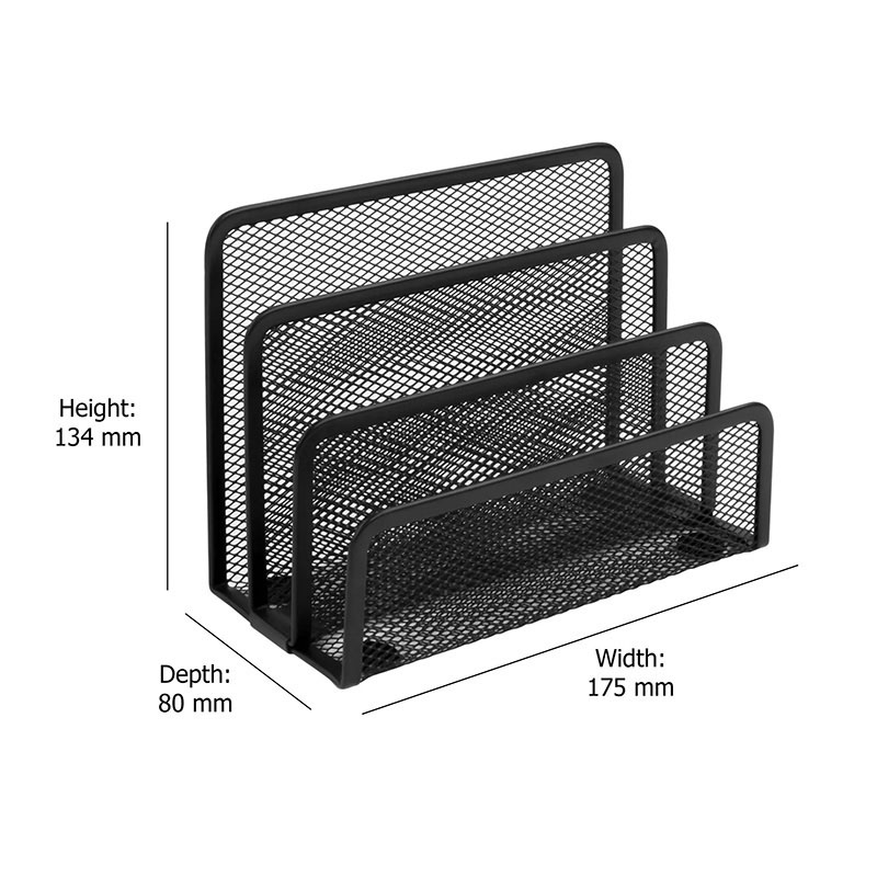 Ανθεκτικός φακελοστάτης κλασσικής αισθητικής με χωρίσματα που καθιστά δυνατή την αποθήκευση πολυάριθμων γραμμάτων και επιτρέπει την εύκολη πρόσβαση τους. Διαθέτει ενσωματωμένα «μαξιλαράκια» από καουτσούκ αποτρέποντας τις γρατζουνιές στην επιφάνεια εργασίας. Συνδυασμός αντοχής και ελαφρότητας που επιτυγχάνεται με τη σειρά Wiremesh υψηλής πυκνότητας αποκλειστικά από την OSCO. Διαστάσεις: Υ134 x Π175 x Β80mm. Βάρος: 0,19 kg.