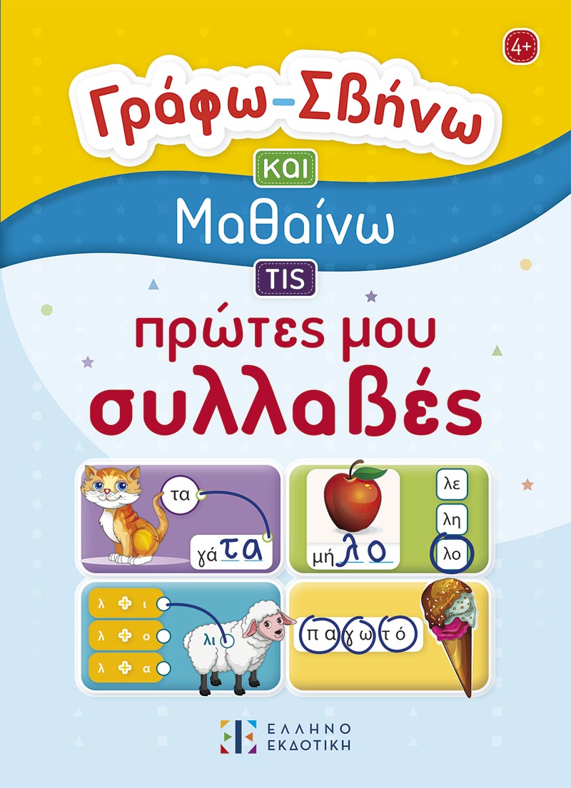 Το βιβλίο Γράφω – Σβήνω και Μαθαίνω τις πρώτες μου συλλαβές απευθύνεται σε παιδιά ηλικίας 4+ ετών. Μέσα από ευχάριστες και πρωτότυπες δραστηριότητες, τα παιδιά: -συνδυάζουν τα φωνήεντα και τα σύμφωνα και σχηματίζουν συλλαβές και λέξεις, -αναγνωρίζουν βασικές λέξεις, -εμπλουτίζουν το λεξιλόγιό τους.