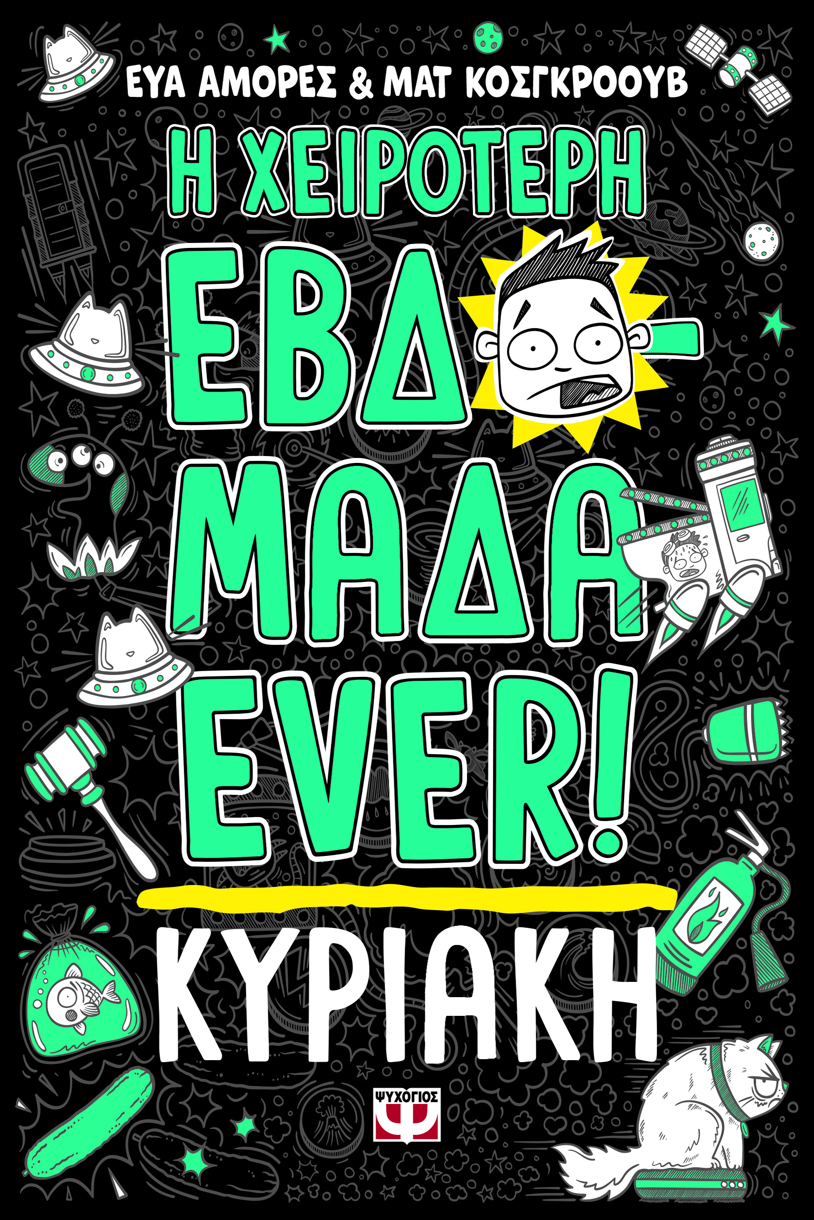 ΕΣΕΙΣ έχετε ζήσει ποτέ ΚΑΚΗ ΕΒΔΟΜΑΔΑ; Ο Τζάστιν Τσέις σίγουρα ναι, και είναι ΑΥΤΗ! Εκεί που νόμιζε ότι τίποτα δε θα μπορούσε να ξεπεράσει τον όλεθρο και την ξεφτίλα της ΔΕΥΤΕΡΑΣ, της ΤΡΙΤΗΣ, της ΤΕΤΑΡΤΗΣ, της ΠΕΜΠΤΗΣ, της ΠΑΡΑΣΚΕΥΗΣ και του ΣΑΒΒΑΤΟΥ (ο χαμούλης με τα ζόμπι σάς λέει κάτι;!) έρχεται η… ΚΥΡΙΑΚΗ! Είναι η ΧΕΙΡΟΤΕΡΗ, τέλος! Εξωγήινοι με άγριες διαθέσεις απάγουν τον Τζάστιν και ξαφνικά, η μοίρα του πλανήτη πέφτει στους ώμους του (όταν δεν μπορεί ούτε ένα πους απ να κάνει!) Λέτε να τα καταφέρει; Όπως και να έχει, ετοιμαστείτε για το συγκλονιστικό τέλος της επικής σειράς βιβλίων που σπάει ταμεία σε όλο τον κόσμο! Η ΚΥΡΙΑΚΗ είναι το κάτι άλλο. Εύα Αμόρες. Η Χειρότερη Εβδομάδα Ever; Μάλλον το ΚΑΛΥΤΕΡΟ ΒΙΒΛΙΟ EVER. Ματ Κόσγκροουβ Οι γονείς μας είναι σκέτη απογοήτευση. Τα παιδιά των Εύα & Ματ