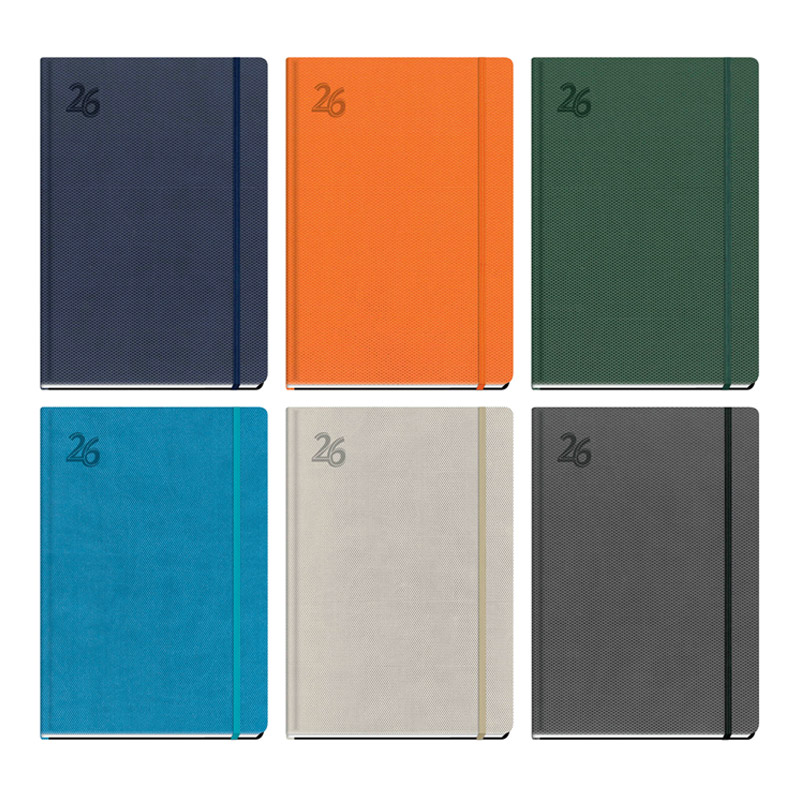 Ημερολόγιο weekly (εβδομαδιαιο) από την σειρά Feelings 4140 Με εξώφυλλα από πυρογραφικό υλικό με κομψό χαρακτηριστικό μοτίβο Διάσταση 16,6 x 23,8 cm 18 σελίδες με πληροφορίες (στην αρχή του ημερολογίου) 160 σελίδες Εύκαμπτη βιβλιοδεσία, με λάστιχο Μονόχρωμη εκτύπωση σε λευκό χαρτί Διάτρηση Στρογγυλές γωνίες Χάρτης Σε 5 χρώματα Carbon, Cypress green, Pearl, Orange, Blue (η επιλογή του χρώματος είναι τυχαία)