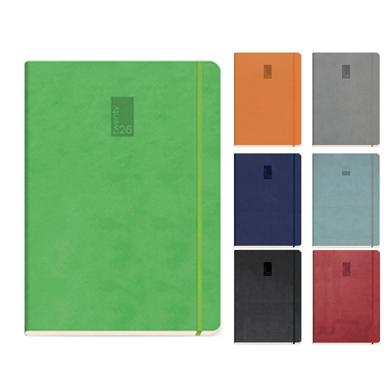 Ημερολόγιο daily (ημερήσιο) από την σειρά Inspirations 3500 Με εξώφυλλα από λείο minimal πυρογραφικό υλικό Διάσταση 21 x 26 cm 7 σελίδες με πληροφορίες (στην αρχή του ημερολογίου) 400 σελίδες Σάββατο - Κυριακή σε ξεχωριστές σελίδες Εύκαμπτη βιβλιοδεσία, με λάστιχο Μονόχρωμη εκτύπωση σε λευκό χαρτί Διάτρηση Στρογγυλές γωνίες Σε 7 χρώματα Grey, Grass green, Burgundy, Orange, Blue, Black, Cool grey (η επιλογή του χρώματος είναι τυχαία)