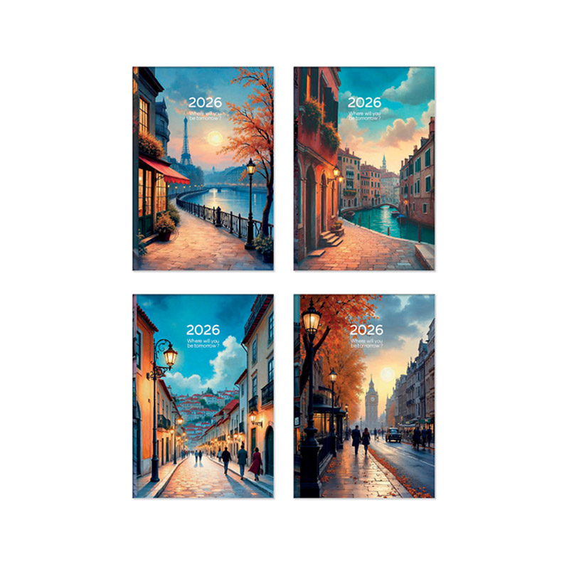 Ημερολόγιο daily (ημερήσιο) από την σειρά City Views Με εξώφυλλα με 4χρωμη εκτύπωση και ματ πλαστικοποίηση Διάσταση 13,8 x 20,4 cm 22 σελίδες με πληροφορίες (στην αρχή του ημερολογίου) 368 σελίδες Σάββατο - Κυριακή σε 1 σελίδα Βιβλιοδεσία με αφρολέξ Δίχρωμη εκτύπωση σε λευκό χαρτί Δίχρωμη χάρτινη ευρετηρίαση για εύκολη πρόσβαση σε κάθε μήνα Διάτρηση Χάρτης Σε 4 μοναδικά σχέδια (η επιλογή του σχεδίου είναι τυχαία)