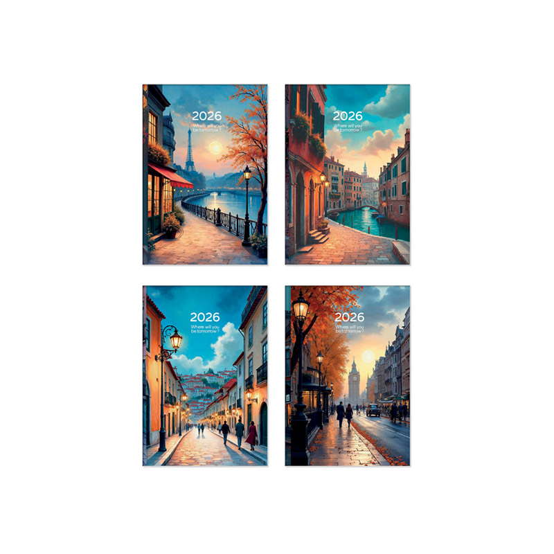 Ημερολόγιο daily (ημερήσιο) από την σειρά City Views Με εξώφυλλα με 4χρωμη εκτύπωση και ματ πλαστικοποίηση Διάσταση 11,4 x 16,4 cm 7 σελίδες με πληροφορίες (στην αρχή του ημερολογίου) 400 σελίδες Σάββατο - Κυριακή σε ξεχωριστές σελίδες Βιβλιοδεσία με αφρολέξ Δίχρωμη εκτύπωση σε λευκό χαρτί Δίχρωμη χάρτινη ευρετηρίαση για εύκολη πρόσβαση σε κάθε μήνα Διάτρηση Σε 4 μοναδικά σχέδια (η επιλογή του σχεδίου είναι τυχαία)