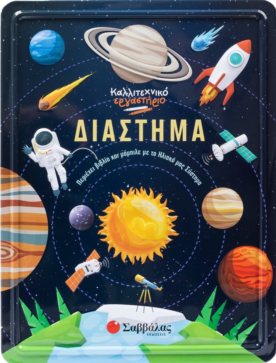 Στο κουτί αυτό θα βρεις: Εικονογραφημένο βιβλίο 32 σελίδων για να μάθεις τα πάντα για το διάστημα. 40 αυτοκόλλητα που φωσφορίζουν στο σκοτάδι! Μόμπιλε με το Ηλιακό μας Σύστημα και όλα τα υλικά για να το συναρμολογήσεις!