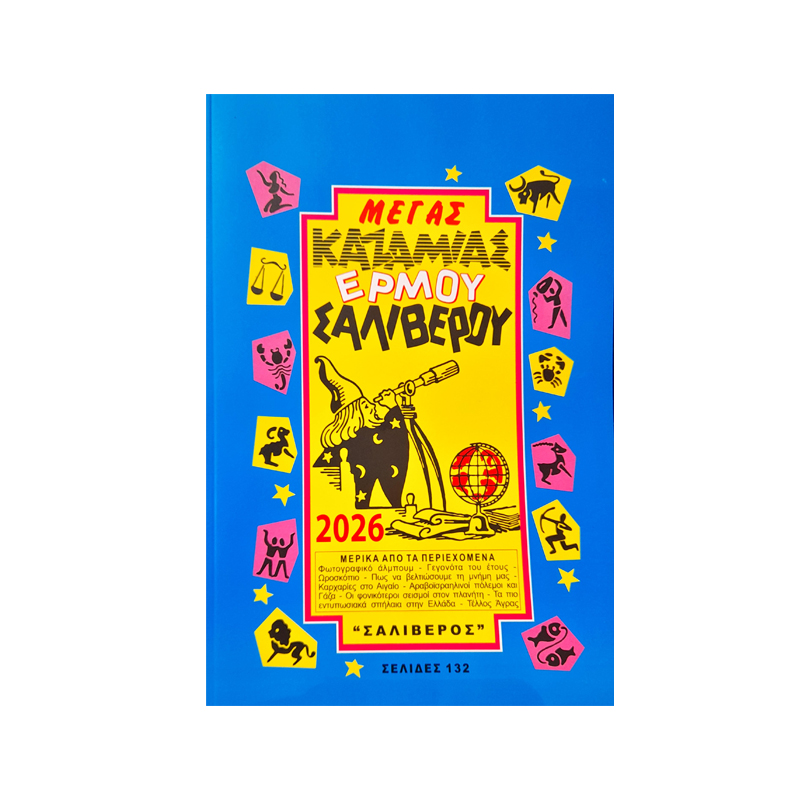 Μέγας Καζαμίας Ερμού Σαλίβερου Περιέχει τις εκλείψεις του χρόνου, ημερολόγιο, εορτολόγιο, κοσμοιστορικές χρονολογίες, συνταγές, ονειροκρίτης, κυριότερες γιορτές και αργίες και άλλα. Περιέχει επίσης ξεματιάσματα, προστασία δέρματος, ανέκδοτα, ωροσκόπιο και μαγειρική Διάσταση 17 x 24,5 cm