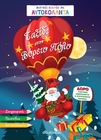 Ποιος µπορεί να κάνει τον γύρο του κόσµου µέσα σε µια νύχτα; Ο Άγιος Βασίλης! Ταξιδέψτε μαζί του στον Βόρειο Πόλο και ανακαλύψτε το μυστικό εργαστήρι των δώρων. Εκεί θα βρείτε έξυπνα παιχνίδια, γιορτινές ζωγραφιές και πολύχρωμα αυτοκόλλητα για ατέλειωτες ώρες διασκέδασης!