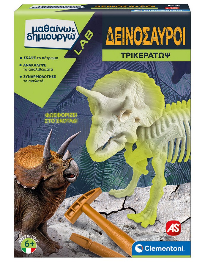 Ετοιμάσου για ένα συναρπαστικό ταξίδι στο παρελθόν! Με το σφυρί και το καλέμι μπορείς να σκάψεις και να ξεθάψεις τα αρχαία απολιθώματα του Τρικεράτοπα. Συναρμολόγησε το σκελετό και δες τον να φωσφορίζει στο σκοτάδι. Επίσης, έχεις τη δυνατότητα να δεις το δεινόσαυρο να ζωντανεύει μέσω επαυξημένης πραγματικότητας. Κατεβάζοντας τη δωρεάν εφαρμογή και σαρώνοντας την κάρτα, βλέπεις στη συσκευή σου τον Δεινόσαυρο να ζωντανεύει! Τα παιχνίδια της σειράς Μαθαίνω και Δημιουργώ, κατέχουν κορυφαία θέση στην κατηγορία επιστημονικών παιχνιδιών, παρέχοντας πλούσιο εξοπλισμό, αναλυτικές πληροφορίες και οδηγίες, για την πραγματοποίηση εντυπωσιακών ασφαλών πειραμάτων και κατασκευών, δίνοντας έτσι την ευκαιρία στα παιδιά να γνωρίσουν τις επιστήμες. Είναι μια καινοτόμος σειρά παιχνιδιών με την οποία τα παιδιά θα διασκεδάσουν κάνοντας πειράματα, χρησιμοποιώντας επιστημονικά εργαλεία, ανακαλύπτοντας τη φυσική, τη χημεία, την αστρονομία, τη βιολογία, τη βοτανολογία, καθώς επίσης και τα κύρια επιστημονικά και φυσικά φαινόμενα. Τα παιχνίδια Μαθαίνω και Δημιουργώ, είναι ο πιο δημιουργικός, ευχάριστος και ασφαλής τρόπος για να μάθουν τα παιδιά τα μυστικά των Επιστημών!
