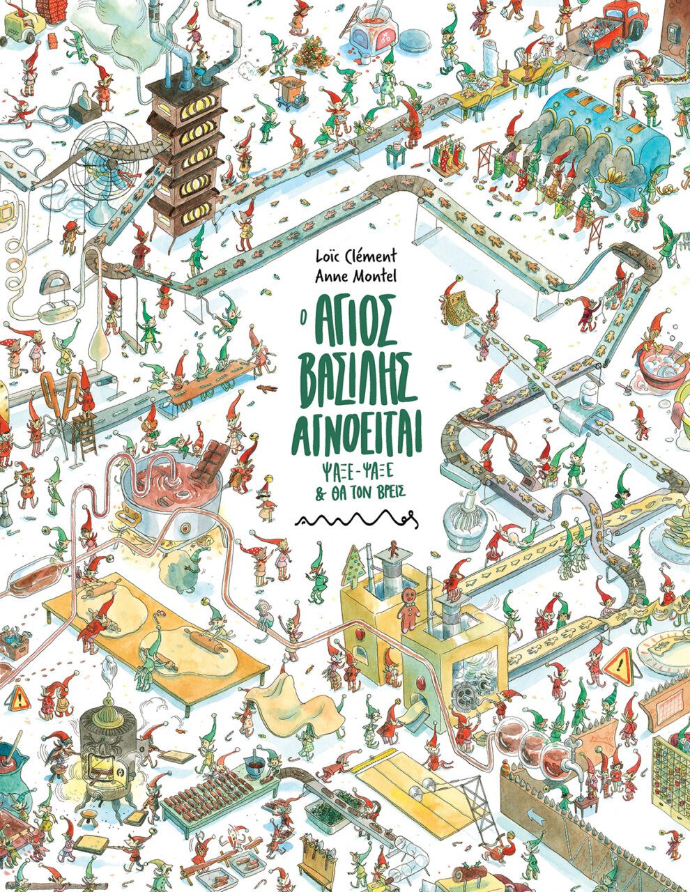 “Ο Άγιος Βασίλης αγνοείται εδώ και κάμποσες ημέρες! Υποψιαζόμαστε ότι έχει κρυφτεί στις σελίδες αυτού του βιβλίου. Αν τον εντοπίσετε, επικοινωνήστε με τη Λουδοβίκη στη γραμματεία του Βόρειου Πόλου. Ευχαριστούμε θερμά εκ των προτέρων, τα ξωτικά, που ανησυχούν πολύ.” Τα ξωτικά βρίσκονται σε φρενίτιδα: η 24η Δεκεμβρίου πλησιάζει, αλλά ο Άγιος Βασίλης έχει εξαφανιστεί! Πηγαίνετε στο Βόρειο Πόλο για να τους δώσετε ένα χεράκι! Καθώς γυρίζουν οι σελίδες, μικροί και μεγάλοι εξερευνούν το μυθικό εργαστήριο, από το εργοστάσιο χαρτιού περιτυλίγματος μέχρι το δωμάτιο όπου φτιάχνονται τα άσχημα πουλόβερ και μέχρι τους στάβλους των ταράνδων. Ένα ΜΕΓΑΛΟ βιβλίο, για να μπουν τα παιδία μέσα και να αναζητήσουν τον Άγιο Βασίλη ανάμεσα σε εκατοντάδες φιγούρες. Είναι μαγικό!